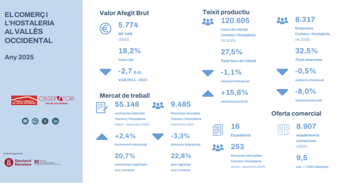 L'Observatori del Consell Comarcal presenta una nova edició de l’informe "El Comerç i l’Hostaleria al Vallès Occidental". Aquest document ofereix una radiografia visual i actualitzada de l'estat del sector, analitzant tant el teixit empresarial com els principals indicadors laborals: ocupació, contractació, atur i expedients de regulació. A més, inclou una anàlisi detallada de l'oferta comercial a la comarca basada en la darrera onada del Cens d'establiments de la Generalitat de Catalunya.